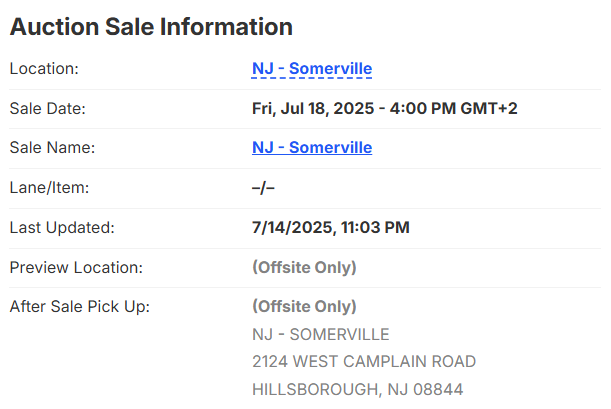 Die Auktion bietet Offsite-Verkäufe an, diese Artikel befinden sich nicht physisch an einem Lagerplatz von Copart, sondern werden über den regulären Auktionsprozess verkauft. Die „Vorschau“ - und „Abhol“ - Standorte sind für jedes Los in der Verkaufsinformation aufgeführt oder können zeitweise auch in Highlights gefunden werden. Die Mitglieder sind verpflichtet, vor der Gebotsabgabe zu überprüfen. Wenn Sie nicht in der Lage sind, das Fahrzeug zu überprüfen, stimmen Sie zu, das genannte Fahrzeug " wie es ist" und ungesehen zu kaufen.
