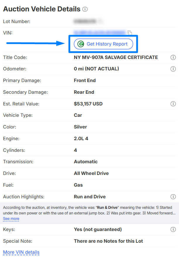 AutoBidMaster recommends that all members fully investigate any vehicle before bidding. To this end we have partnered with ClearVin to offer our members vehicle history reports. To order a ClearVin Vehicle History report look for the "Get History Report" button located in the "Auction Vehicle Details" section of any lot page.