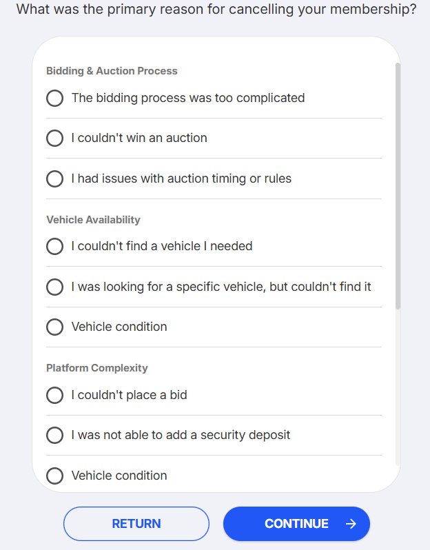 - We'd appreciate it if you could take a quick survey to let us know why you're unsubscribing. This helps us improve our service based on your feedback, whether it's about auction wins or finding the right vehicle.