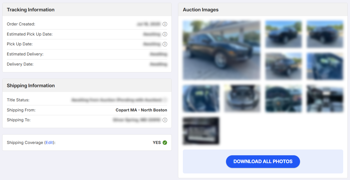 Tak, powinieneś przejść do naszej strony internetowej, kliknąć "Usługi", a następnie "Wysyłka międzynarodowa", korzystając z funkcji "Śledź moje zamówienie". Możesz uzyskać dostęp do zdjęć swojego samochodu na aukcji, przy odbiorze i w magazynie. Przygotowywanie zdjęć pojazdu na koncie AutoBidMaster po jego przybyciu do magazynu zajmuje do 5 dni. Zapewniamy również dodatkowe zdjęcia z załadunku pojazdu, w tym celu należy skontaktować się z nami: export@autobidmaster.com