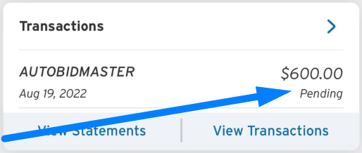Страховые депозиты AutoBidMaster - это временная авторизация кредитной карты, которая отображается в виде ожидающей транзакции, а НЕ в виде списания средств. При возврате гарантийного депозита отложенная транзакция удаляется из способа оплаты.